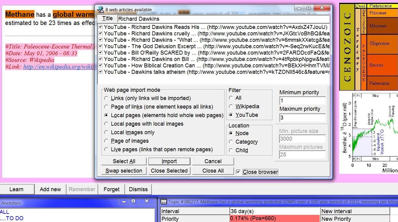 - All (Shift+Ctrl+A) - import learning material from Internet Explorer. You can import the content or links to web pages currently opened in Internet Explorer. If you have more than one copy of Internet Explorer opened, you can import from many web pages at once. This option also makes it possible to close instances of Internet Explorer that are no longer needed (e.g. during or after page import), import pictures, import live pages, etc. Web import as Local pages takes only the selected portion of the text in the browser (or all text, it none is selected); this does not apply to Wikipedia or YouTube imports (below); imported selections are marked as Portion of: in the reference title. Typical web import with only a portion of text selected in the browser. All references are added automatically.