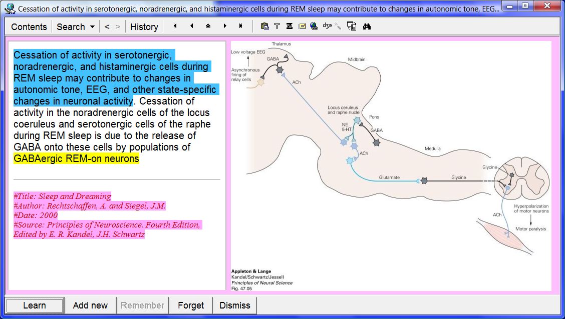 In the picture above, an extract from an article on sleep and dreaming is presented. Blue marks an extract produced from the presented text. Yellow marks the search string (i.e. GABAergic REM-on neurons) that was used in Search : Find elements (Ctrl+F) to find all the elements (including this one) containing the string. Pink marks the reference area (consisting of the Title, Author, Date, and Source fields), which will propagate to all children elements (extracts and clozes) generated from this element.
