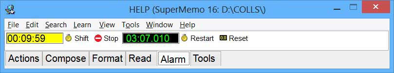 Figure: The Alarm toolbar docked in the learnbar. In the picture, the Alarm countdown timer shows 18 min. and 49 sec. until the alarm is raised. The Learning time stopwatch shows the user have spent 1 min., 2 sec., and 575 milisec. on answering questions since SuperMemo was last opened.