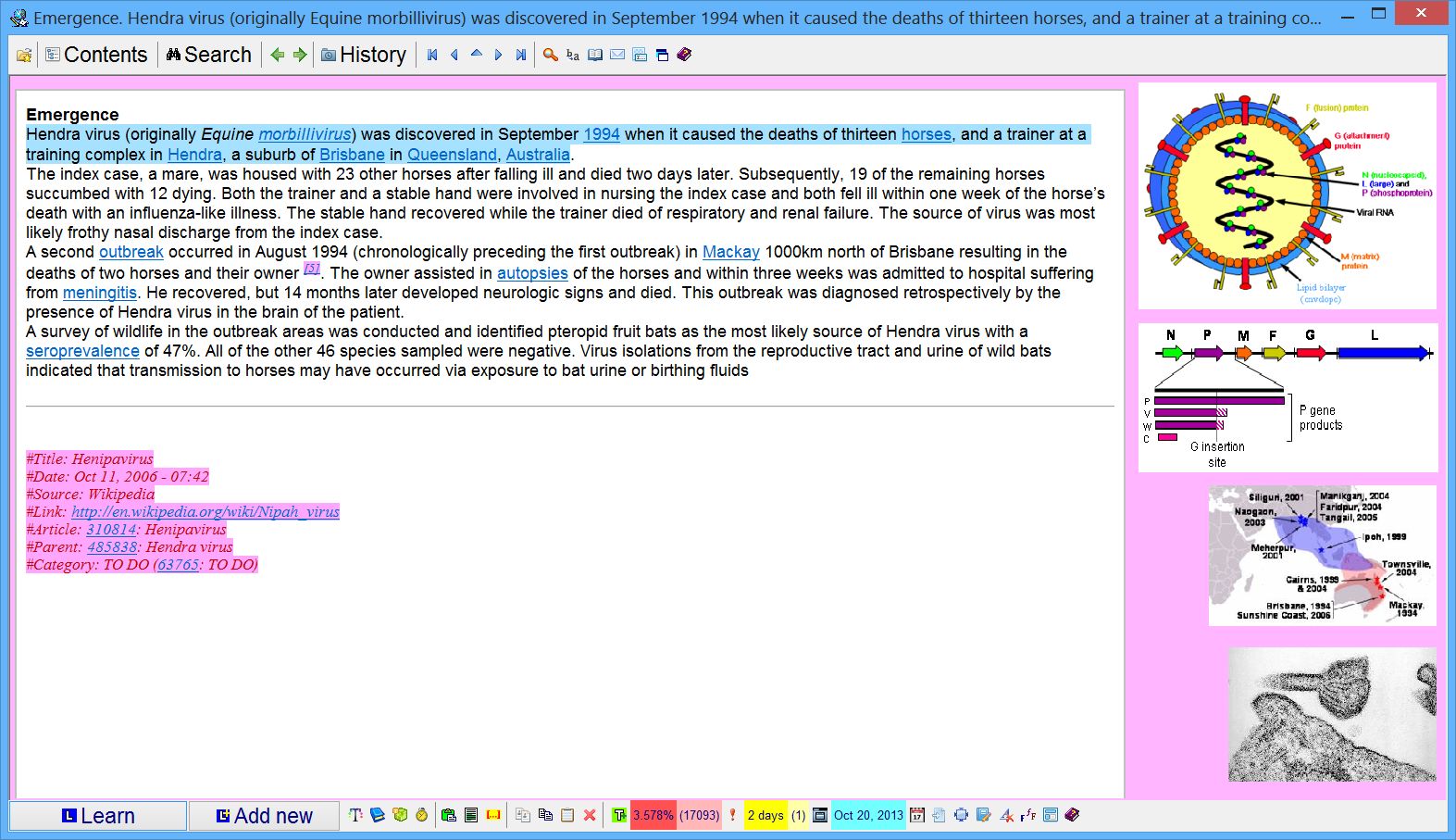 Figure: A topic with an article about henipavirus in the HTML component on the left and 4 images taken from the article with Download images (Ctrl+F8) (available on the component context menu), which downloaded, localized, and tiled them in their individual image components on the right. These 4 images will propagate to all extracts and cloze deletions ultimately produced from this article.