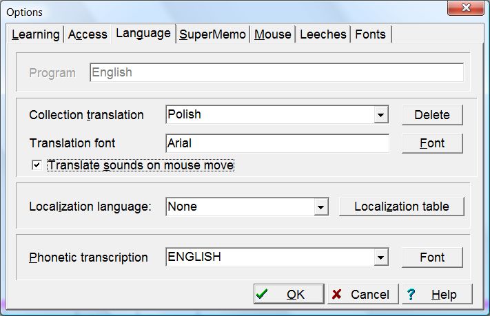 - Phonetic transcription - choose the phonetic transcription for the language you are using in your collection. We are constantly working on the phonetic transcription registry of English (currently 72,000 entries and still growing). This registry is available from SuperMemo Store
