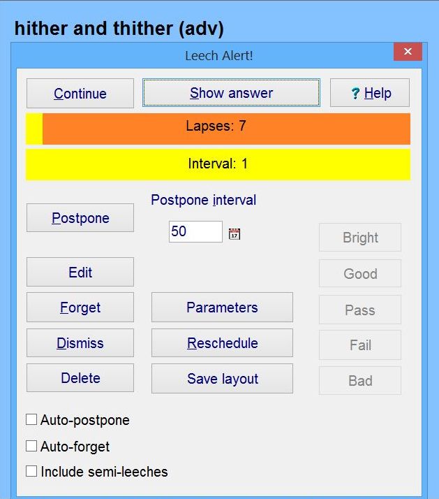 Leech alert: Nice feature, but I hate that per default, the leech window becomes active. I don't want to move my mouse to another window to do the grading. I often use Space bar to activate the default button, and sometimes, it automatically moves to Postpone when I intended to grade myself Good