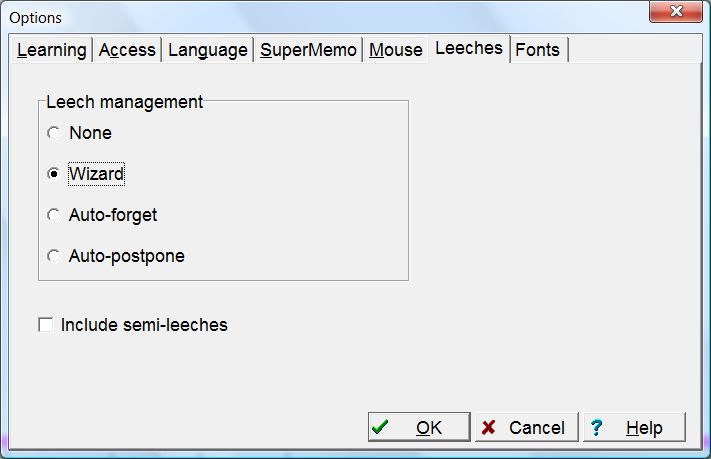 - None - no leech management. During repetitions SuperMemo will treat leeches in the same way as other elements