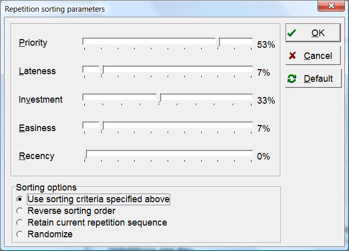 The percentage values of the impact of individual criteria on sorting can be seen to the right from the slide-bars. Change those values by moving the sliders. For example, if you want to repeat rescheduled material with the easiest material coming first, put all sliders to the left and the Easiness slider on the right (Easiness=100%).