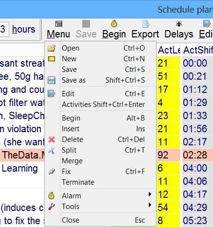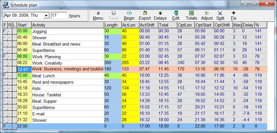 The above file is directly importable to your diary providing a daily record of your performance. Note than none of the activities lasted as long as planned (100%). The figures in the parentheses indicate the actual length (ActLen field), the percentage of time devoted to the activity as compared with the optimum time (OptLen field). Note also that the total time was increased to 17.6 hours on this particular day due to going to sleep 46 minutes later than planned (22:46 instead of 22:00).