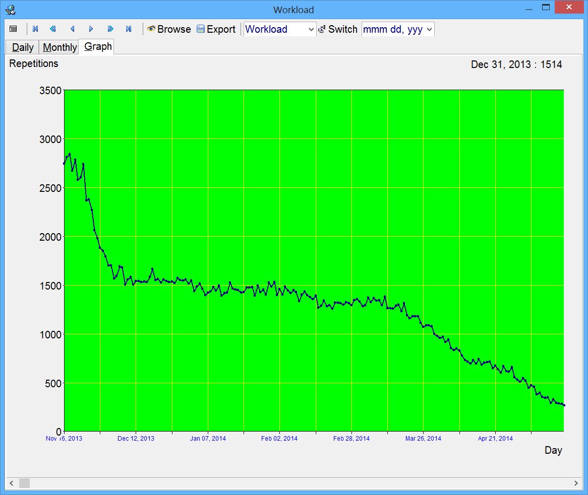 Figure: In the presented picture above, the number of elements scheduled for repetition/review from Nov 16, 2013 until the next year's May. The data displayed at top right corner depends on the position of the mouse. In this example, it indicates that on Dec 31, 2013, there will be 1,514 elements scheduled for review.
