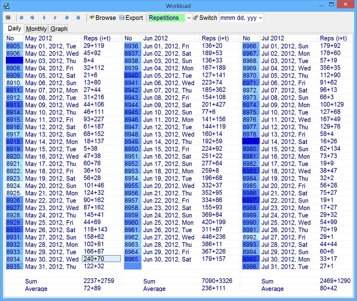 Figure: In the picture above, the record of repetitions executed over a three-month period between May and Jul of 2012. Additionally, Daily workload tab displays the monthly total, as well as the daily average. Note that the number of executed repetitions in the workload may differ from the number of elements in the history subset for that day (e.g. opened by pressing Enter on a selected entry). For example, the same element can be memorized and reset more than once. However, it will appear only once in the history subset. Depending on the operation, elements may or may not register in the history subset. For example, cloze deletions produced by Decompose will register on the assumption that you cannot execute Decompose without first reviewing the decomposed phrase. However, Dismember will not register child elements. For example, you might have just dismembered a page with multiple pictures without having time to review those pictures.