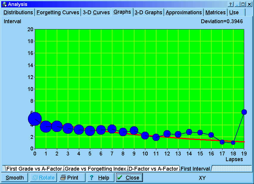 D-Factor vs. A-Factor graph - DF-AF graph shows decay constants of power approximation of R-Factors along columns of the RF matrix. You need to understand SuperMemo Algorithm to understand this graph. The horizontal axis represents A-Factor, while the vertical axis represents D-Factor (i.e. Decay Factor). D-Factor is a decay constant of power approximation of curves that can be inspected with the Approximations tab of the Analysis dialog box