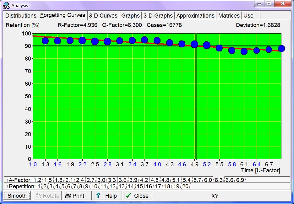 Blue circles in the picture represent data collected during repetitions. The larger the circle, the greater the number of repetitions recorded. The red curve corresponds with the best-fit forgetting curve obtained by exponential regression. For ill-structured material the forgetting curve is crooked, i.e. not exactly exponential. The horizontal green line corresponds with the requested forgetting index, while the vertical green line shows the moment in time in which the approximated forgetting curve intersects with the requested forgetting index line. This moment in time determines the value of the relevant R-Factor, and indirectly, the value of the optimum interval. For the first repetition, R-Factor corresponds with the first optimum interval. The values of O-Factor and R-Factor are displayed at the top of the graph. They are followed by the number of repetition cases used to plot the graph. At the beginning of the learning process, there is no repetition history and no repetition data to compute R-Factors. It will take some time before your first forgetting curves are plotted. For that reason, the initial value of the RF matrix is taken from the model of a less-than-average student. The model of average student is not used because the convergence from poorer student parameters upwards is faster than the convergence in the opposite direction. The Deviation parameter displayed at the top tells you how well the negatively exponential curve fits the data. The lesser the deviation, the better the fit. The deviation is computed as a square root of the average of squared differences (as used in the method of least squares).