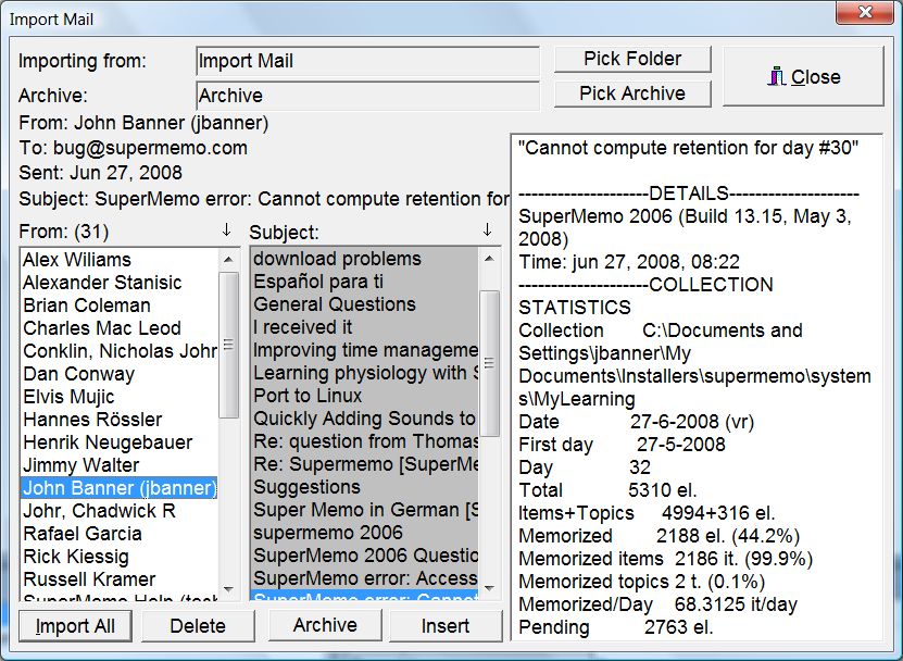 - Importing e-mail to your learning process: Incremental reading is a powerful tool that helps you prioritize and process mail. As a result, you may decide that instead of using your mail software, it is more convenient to use SuperMemo to read and respond to your e-mail. Users of MS Outlook can now import mail to SuperMemo with a keystroke