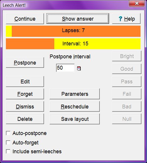 Leech alert: Nice feature, but I hate that per default, the leech window becomes active. I don't want to move my mouse to another window to do the grading. I often use Space bar to activate the default button, and sometimes, it automatically moves to Postpone when I intended to grade myself Good