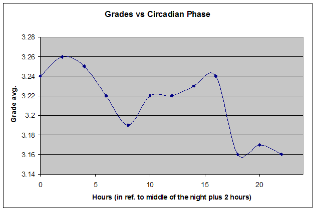 However, when the free-running sleep data presented in the graph above is processed using the circadian phase rather than the clock phase, a typical two-peak circadian pattern re-emerges with good grades in the morning, siesta dip, and an evening upswing. The circadian phase estimations have been generated with SleepChart. The peak learning times are usually separated by 10-13 hours: