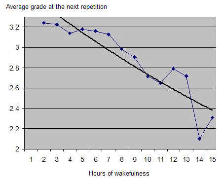 My first, most atavistic, and raw intuition was that it should be easy to show that short sleep produces poor learning. I took my own sleep-and-learning data to quickly investigate such a correlation. However, nearly a reverse relationship could be demonstrated. In retrospect, the paradox is very easy to explain: in free running sleep (which I practise religiously), there is a correlation between the quality of sleep and its length: the better the alignment of the sleep block with the circadian rhythm, the shorter the sleep, and the better its quality. It became apparent that little evidence can be garnered without considering the circadian timing of learning (i.e. the time of learning in reference to the waking hour). Sadly, earlier versions of SuperMemo kept only the date of the repetition, not its precise time. That has changed with SuperMemo 2006 released a few months ago. Now it is possible to correlate sleep data with learning in precise time frames!