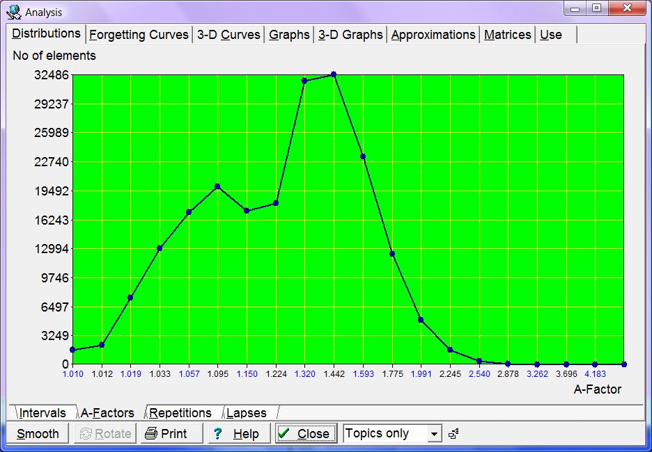 These graphs show the forgetting curves in 3 dimensions. There are 20 graphs available with A-Factor tabs at the bottom. Each graph corresponds to a different A-Factor (from 1.2 to 6.9). The X axis represents time (as in Forgetting curves). The Y axis represents repetition category (roughly corresponding to the repetition number). The vertical Z axis represents retention in percent (i.e. how much is remembered at a given moment in time). For better visibility, you can rotate 3-D forgetting curves with Rotate, or smooth them with Smooth. Rotate swings the graph on its Z axis by 90 degrees clockwise (as viewed from above). This means that X and Y axes get swapped. Note that smoothing proceeds along the Y axis. This makes it possible to align incompletely plotted forgetting curves from different repetition categories. However, once you click Rotate, Y axis smoothing will produce a different result (e.g. after the first Rotate, smoothing will reduce kinks along the repetition categories). For the best illustration of the forgetting process, smooth the graph before you rotate it.