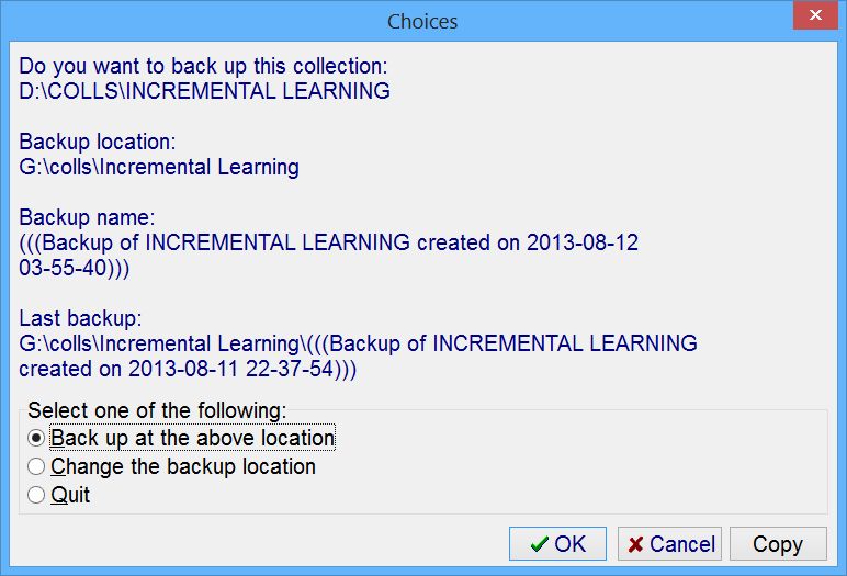 The fastest way to quickly backup your collection is to use Shift+F12 (or File : Backup from the main menu). Backup will skip non-essential files (e.g. temporary files). It will also name your backup with the date on which it was created. For example, if your collection's name is Incremental Learning.kno your backup might get named (((Backup of Incremental Learning created on 2013-08-12 03-55-40))). This name tells you that the backed up collection's name is Incremental Learning, and that the collection was backed up on Aug 12, 2013 after 3:55.