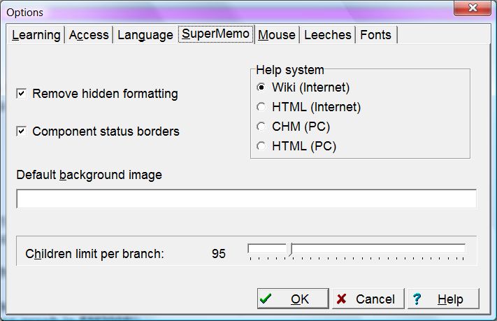 - Wiki (Internet) - (default option) use wiki help located at help.supermemo.org as the source of SuperMemo documentation