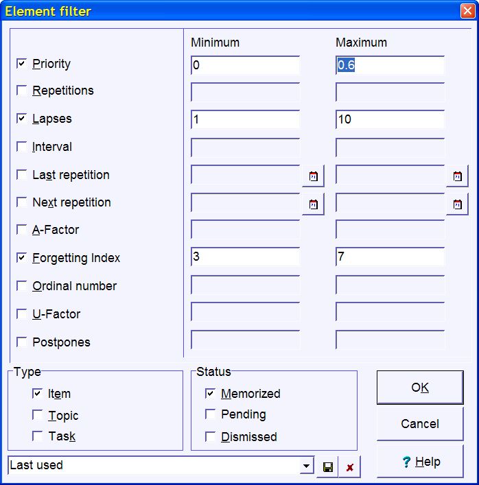 The fields Type and Status make it possible to find items, topics or tasks with different pending, memorized or dismissed status. For example, to find all memorized elements, check Item, Topic and Memorized and leave the remaining fields unchecked (tasks cannot have the memorized status).