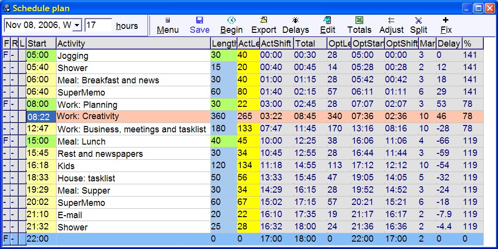 The above file is directly importable to your diary providing a daily record of your performance. Note than none of the activities lasted as long as planned (100%). The figures in the parentheses indicate the actual length (ActLen field) and the percentage of time devoted to the activity as compared with the optimum. Note also that the total time was increased to 16.5 hours on this particular day due to going to sleep 30 minutes later than planned (22:30 instead of 22:00).