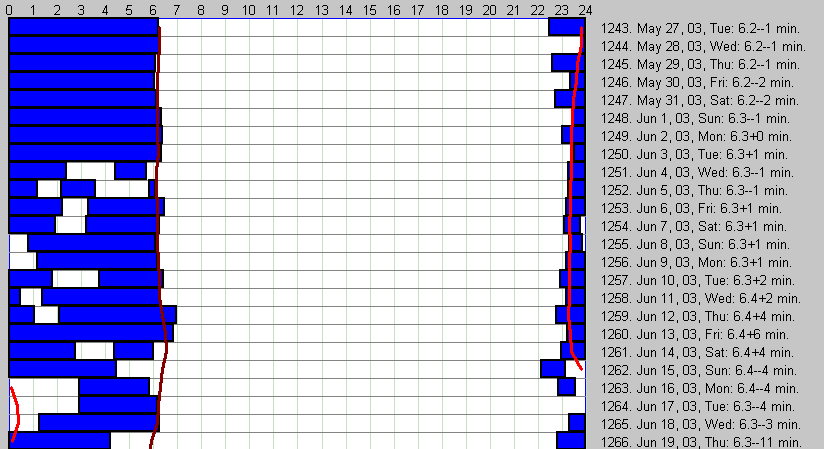 Asynchronous DSPS. People suffering from DSPS find it difficult to synchronize with 24-hour clock. In the picture below, adolescent female with a mild DSPS suffers disintegration of the sleeping rhythm due to the failed efforts to synchronize with "civilized" life. After the vacation period, she begins in early September well-synchronized with the "rest of the world". She wakes up between 6:30 and 10:00. However, her body clock experiences continuous shift of optimum sleeping hours. Soon she wakes up at 12:00 and begins a struggle against the further shift. This results in disintegration of the sleep cycle, short sleep periods (e.g. 4 hours) and frequent bouts of tiredness. The presented software attempts to plot the hours of maximum natural sleepiness (between red and brown lines). Clearly, the greatest disturbance in sleep occurs at the point where the "natural" rhythm departs furthest from the "desired" rhythm. Mild DSPS cases are able to force the body clock to remain more or less in the desired bounds at the cost of constant struggle with sleepiness. In more severe cases, the circadian variables will run a 24 hour cycle and the individual will experience return to "good sleep" when free running variables align again with the "desired" sleep period. In the graph below, October 7 sleep period is almost aligning with the hours of maximum sleepiness resulting in good long refreshing sleep. The average sleep length is 6.8 hours but it changes widely. The average DSPS shift is difficult to determine due to the "struggle" with the natural rhythm; however, if is likely to be above 60 minutes as evidenced at the beginning of the graph.