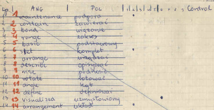 My first experiments were run in parallel with learning human biology and English vocabulary (here English-Polish word pairs on a starting page from June 3, 1982):