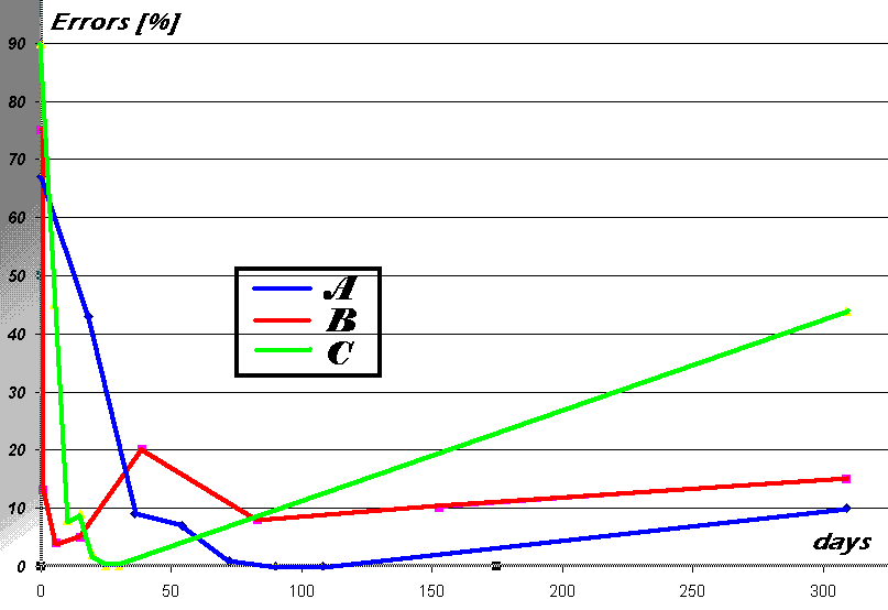 | This text was taken from P.A.Wozniak, Optimization of learning, Master's Thesis, University of Technology in Poznan, 1990. It was spell-checked, and the terminology was adjusted for publication at supermemo.com. Square brackets include comments added later. Archive figures at the bottom were added in 2004. |